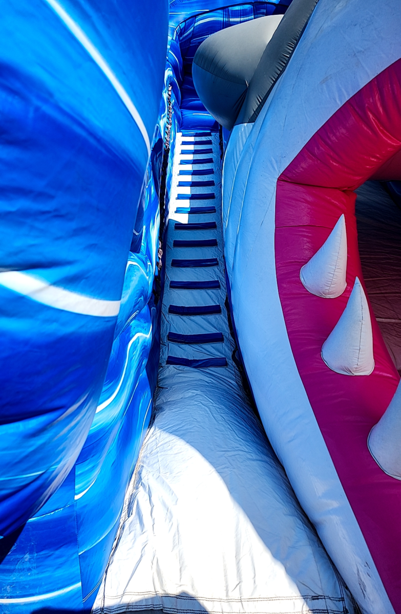 Dive into a thrilling aquatic adventure with the Shark Slide, an exhilarating inflatable designed for up to 2 daring participants at a time. This show-stopping attraction features a towering 25-foot-high slide that delivers an adrenaline-pumping descent from top to bottom.
